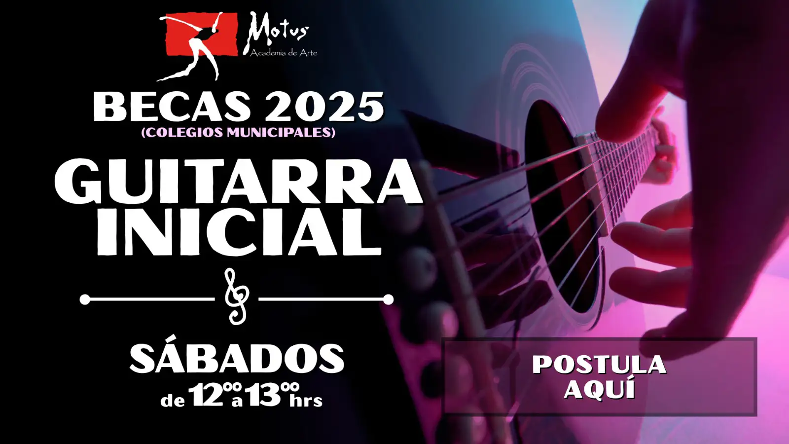 Se otorgarán becas del 100% en arancel y matrícula para el Curso de Música – Guitarra Inicial, en la comuna de Puerto Montt. Las clases se desarrollarán en la Academia, los días sábados de 12:00 a 13:00 hrs.